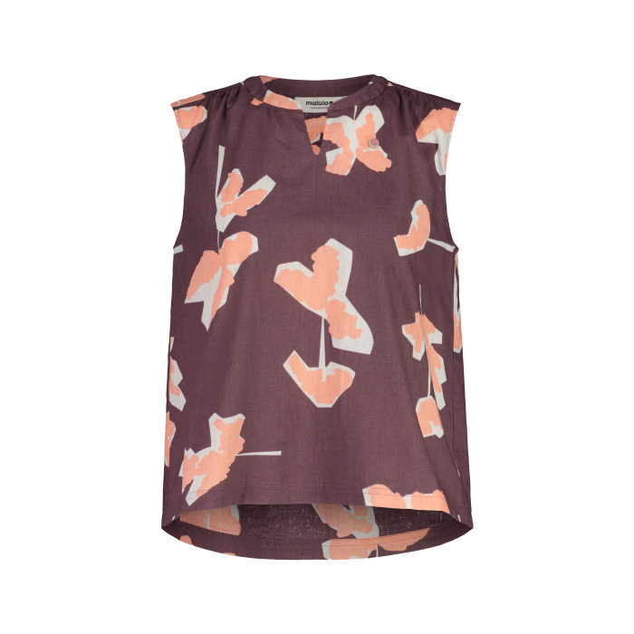 Sommerliches Top aus Hanf und Bio-Baumwolle mit floralen Prints, femininen Rüschen und luftiger Passform – stilvoll, natürlich, angenehm kühl.