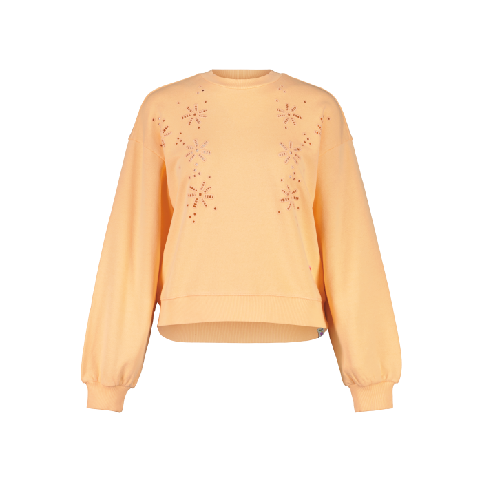 Modern, wide-cut sweatshirt with a round neck, dropped shoulders and sleeves gathered over the ribbed cuffs. The material mix of organic cotton and hemp is extremely comfortable to wear. The tonal eyelet embroidery on the front makes this comfy sweatshirt unique.