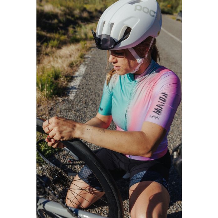 VelikaM. is a high-performance women's roadbike cycling jersey featuring a sleek slim fit and expressive design choices. It comes in four standout versions – including a polarizing rainbow fade, a delicate floral print, and a shadow-inspired design created from plant silhouettes digitally transformed into modern graphic patterns.