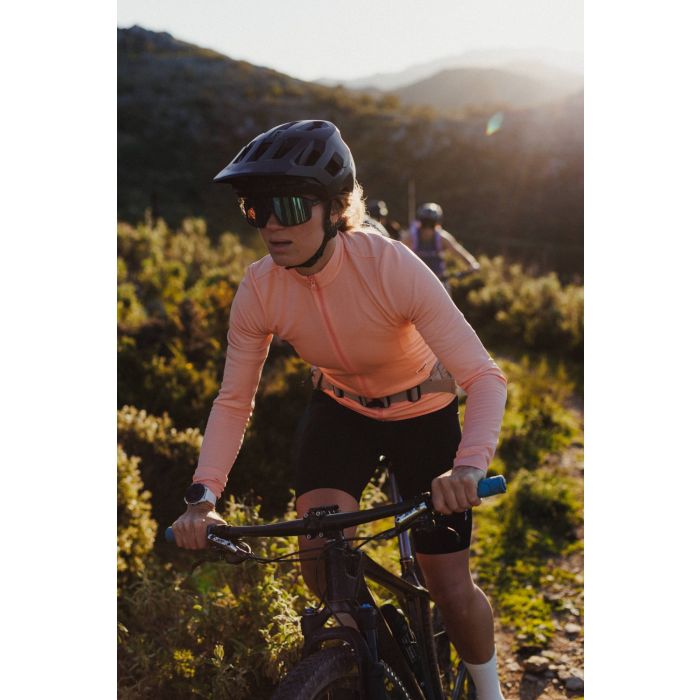 Women’s long sleeve bike jersey with recycled fibers, light insulation and 3 back pockets. Slim fit, quick-drying and breathable.